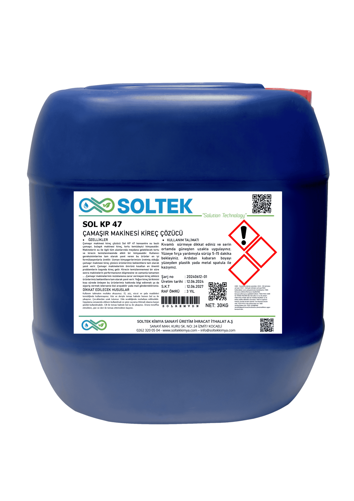 Çamaşır makinesi kireç çözücü Sol KP 47 konsantre su bazlı çamaşır, bulaşık makinesi kireç, tortu temizleyici kimyasaldır. Makinelerin su ile ilgili tüm alanlarında meydana gelebilecek tortu ve kirecin temizlenmesinde etkili bir kimyasaldır. Kullanıcı gereksinimlerine tam olarak yanıt veren bu ürünler en iyi formülasyonlarla üretilir. Uzman kimyagerlerimizin üretmiş olduğu çamaşır makinesi kireç çözücü ürünlerimiz beklentilere tam olarak yanıt verir. Çamaşır makinelerinin ömrünü kısaltan en önemli problemlerin başında kireç gelir. Kirecin temizlenmemesi bir süre sonra makinelerin performansının düşmesine ve zamanla tamamen bozulmasına neden olur. Böyle durumlarda çamaşır makinesi kireç çözücü kullanmak büyük bir öneme sahiptir.