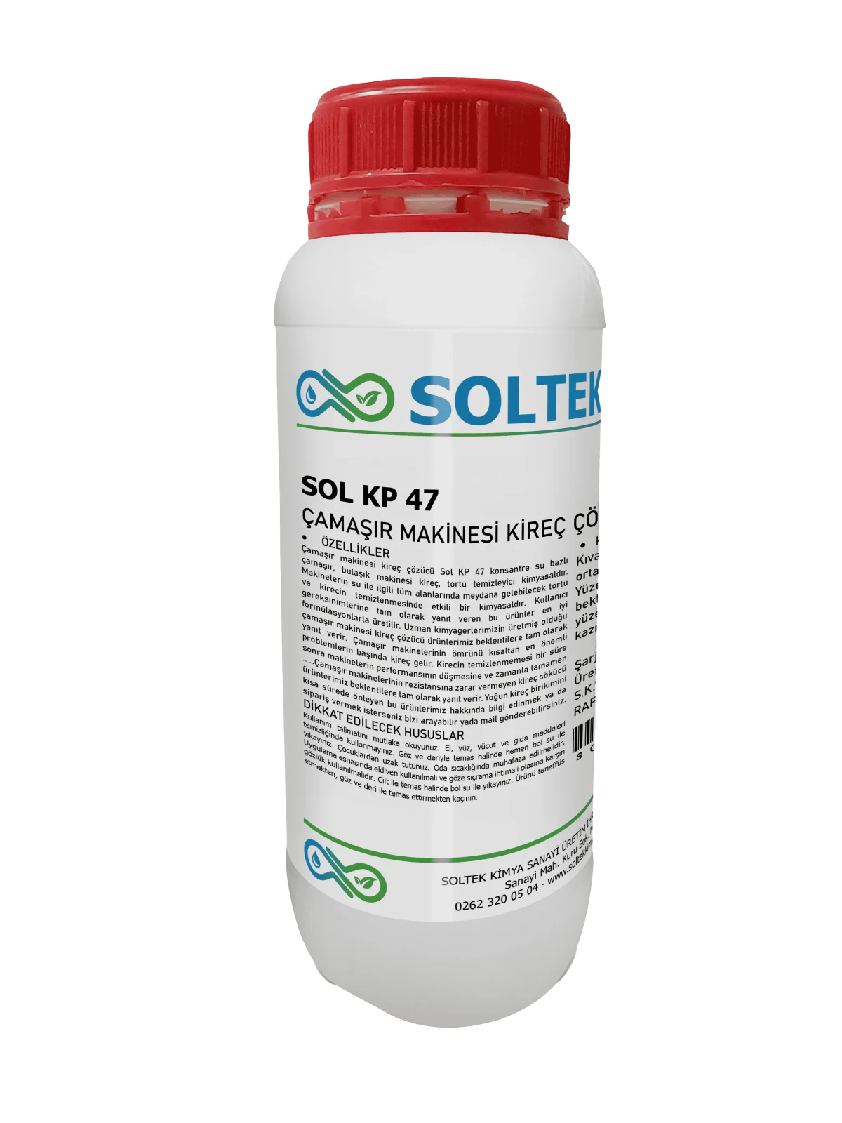 Çamaşır makinesi kireç çözücü Sol KP 47, çamaşır ve bulaşık makinelerinin su ile ilgili tüm alanlarında oluşabilecek kireç ve tortuların etkili bir şekilde temizlenmesi için özel olarak tasarlanmış konsantre su bazlı bir kireç çözücüdür.