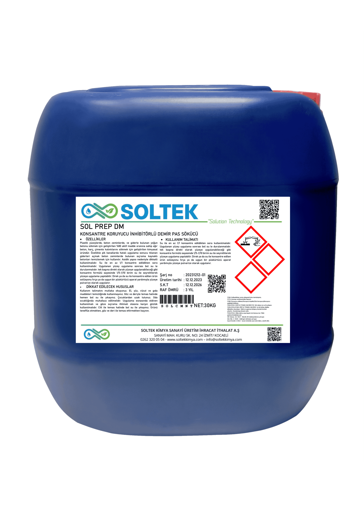 Demir pas sökücü kimyasal ürünümüz Sol Prep DM demirlerdeki ağır pasların temizliğinde kullanılan demir pas sökücüdür. Daldırma yapılması imkansız olan demirleri ve benzeri metallerde püskürtme, spreyleme şeklinde uygulama yapılarak ağır pasların temizlenmesi için geliştirilmiştir. Askıda olan kolan demirleri, tabya ve perde filizlerindeki ağır pasları püskürterek kolay bir şekilde temizlenmesini sağlar. Demir pas sökücü kimyasal ürünümüz konsantre olması su ile seyreltip kullanma imkanı tanır. Koruyucu inhibitörlü olmasından dolayı inşaat demirinin nevrülün de aşındırma yapmaz. İnşaat demirlerinde nevrül çok önemlidir. Pas sökücü kimyasalın nevrülü mikron boyutta aşındırması bile betonun demire tutunmasını etkileyecektir. Sol Prep DM’nin içeriğinde bulunan koruyucu inhibitörler asidik değerin nevrüllerin aşınmasını önleyici olarak kullanılmaktadır. Soltek Kimya Üretim A. Ş test yapabileceğiniz numuneleri bedelsiz adresinize göndermektedir. İstenilen ambalajlarda satışı yapılmaktadır. Demir pas sökücü ve pas çözücü diğer ürünlerimiz hakkında bilgi almak için bizimle iletişime geçebilir yada mail atabilirsiniz.