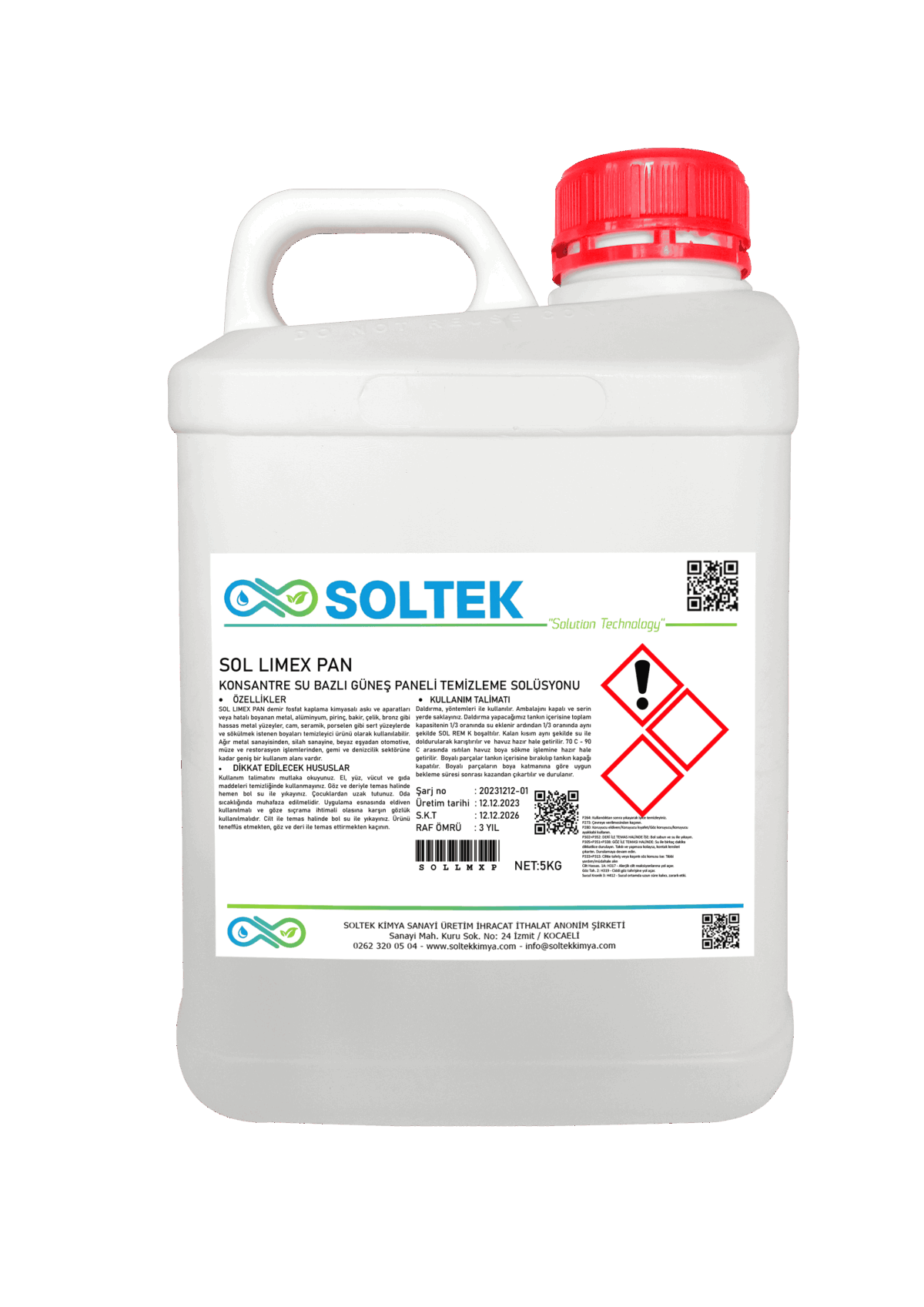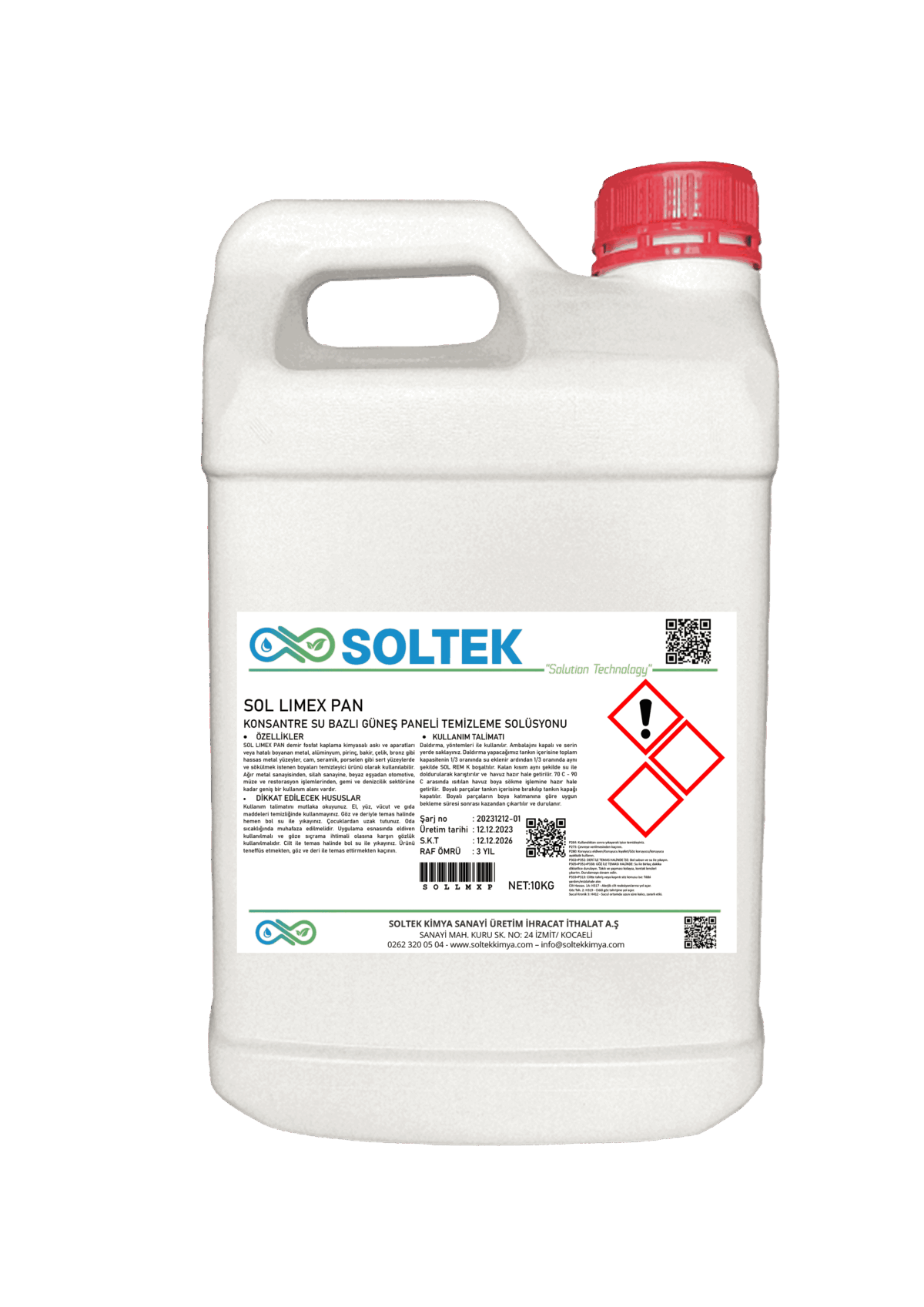 Güneş temizleme solüsyonu Sol Limex Pan, güneş panellerinin üzerinde biriken kirlilikleri etkili bir şekilde temizlemek ve yüzeylerini korumak için özel olarak geliştirilmiş konsantre su bazlı bir temizlik solüsyonudur. Güneş paneli temizleme solüsyonumuz, Soltek Kimya’nın uzman kimya mühendisleri tarafından üretilmiştir.