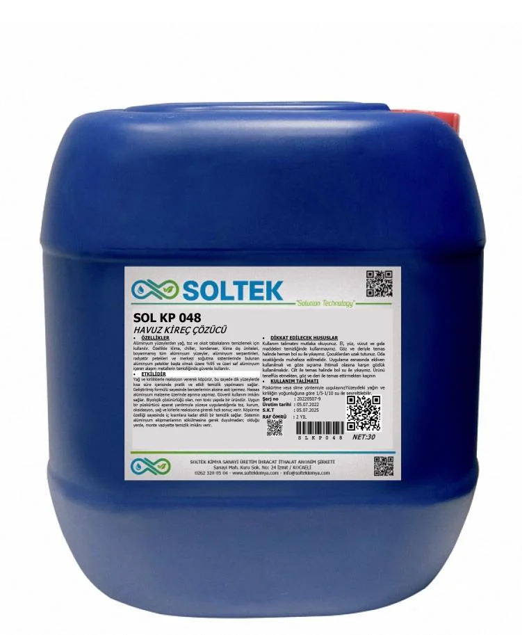 Sol KP 048 havuz kireç çözücü etkili şekilde kireç birikimini temizlemek, havuzunuzun temiz, sağlıklı ve estetik görünmesini sağlamak için üretilmiş kimyasal üründür.