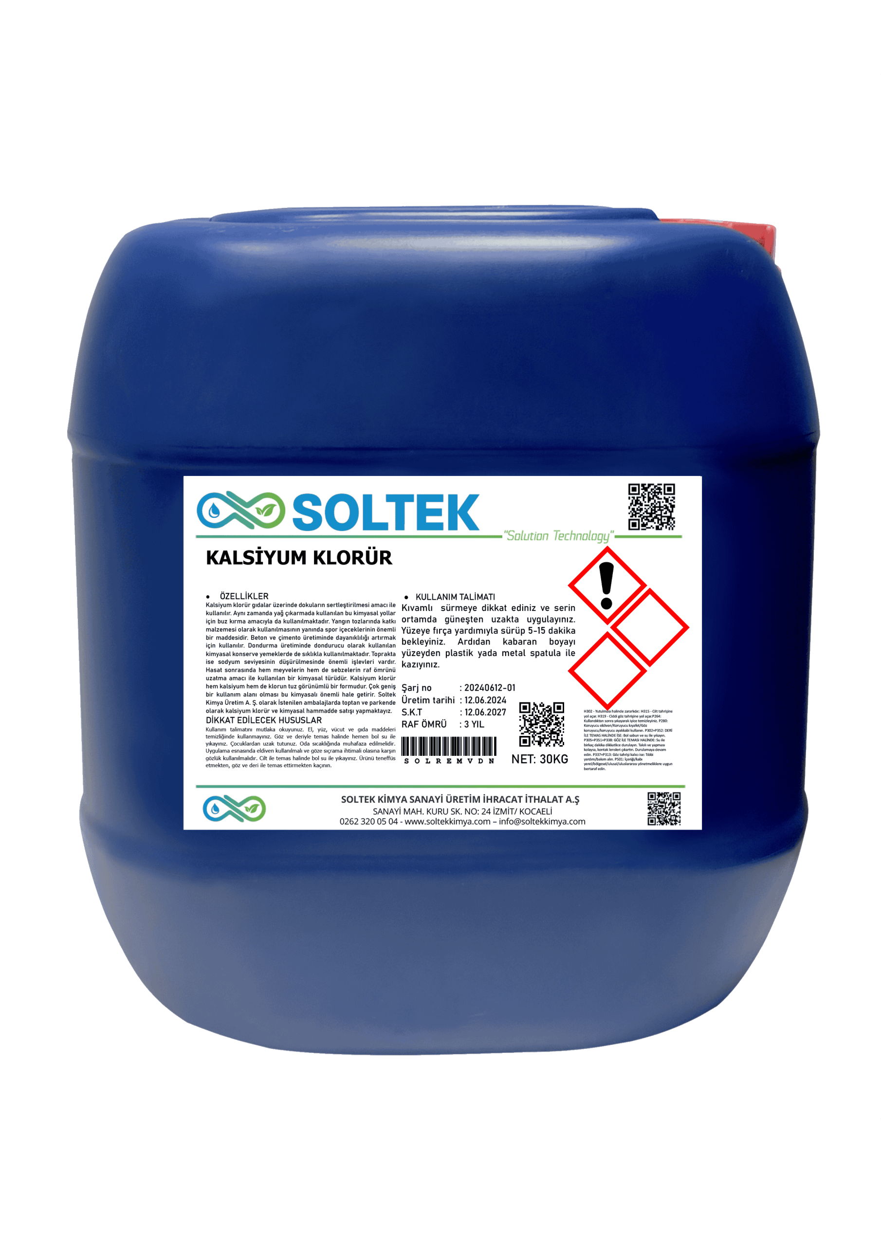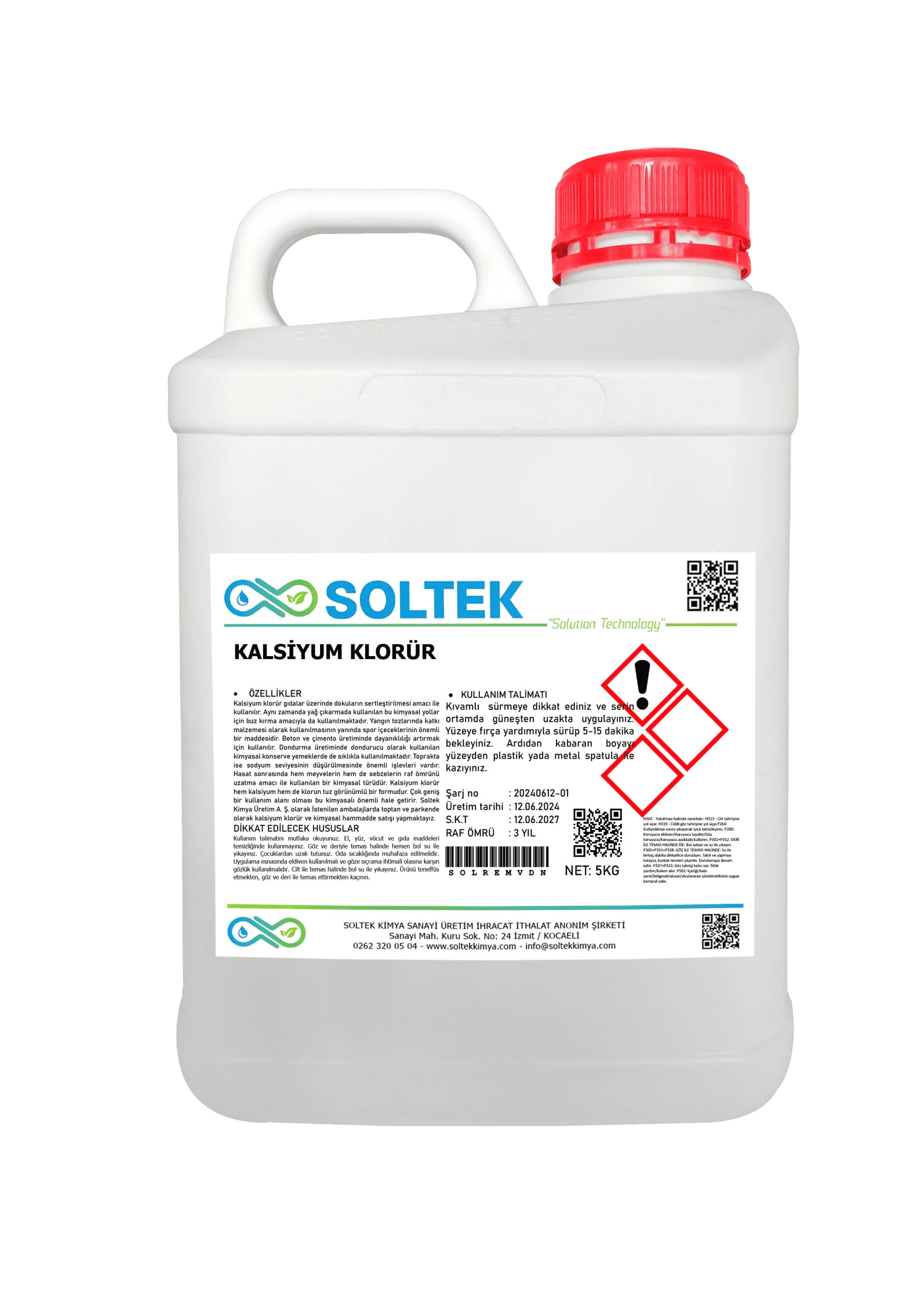 Kalsiyum klorür gıdalar üzerinde dokuların sertleştirilmesi amacı ile kullanılır. Aynı zamanda yağ çıkarmada kullanılan bu kimyasal yollar için buz kırma amacıyla da kullanılmaktadır. Yangın tozlarında katkı malzemesi olarak kullanılmasının yanında spor içeceklerinin önemli bir maddesidir. Beton ve çimento üretiminde dayanıklılığı artırmak için kullanılır. Dondurma üretiminde dondurucu olarak kullanılan kimyasal konserve yemeklerde de sıklıkla kullanılmaktadır. Toprakta ise sodyum seviyesinin düşürülmesinde önemli işlevleri vardır. Hasat sonrasında hem meyvelerin hem de sebzelerin raf ömrünü uzatma amacı ile kullanılan bir kimyasal türüdür. Kalsiyum klorür hem kalsiyum hem de klorun tuz görünümlü bir formudur. Çok geniş bir kullanım alanı olması bu kimyasalı önemli hale getirir. Soltek Kimya Üretim A. Ş. olarak İstenilen ambalajlarda toptan ve parkende olarak kalsiyum klorür ve kimyasal hammadde satışı yapmaktayız.