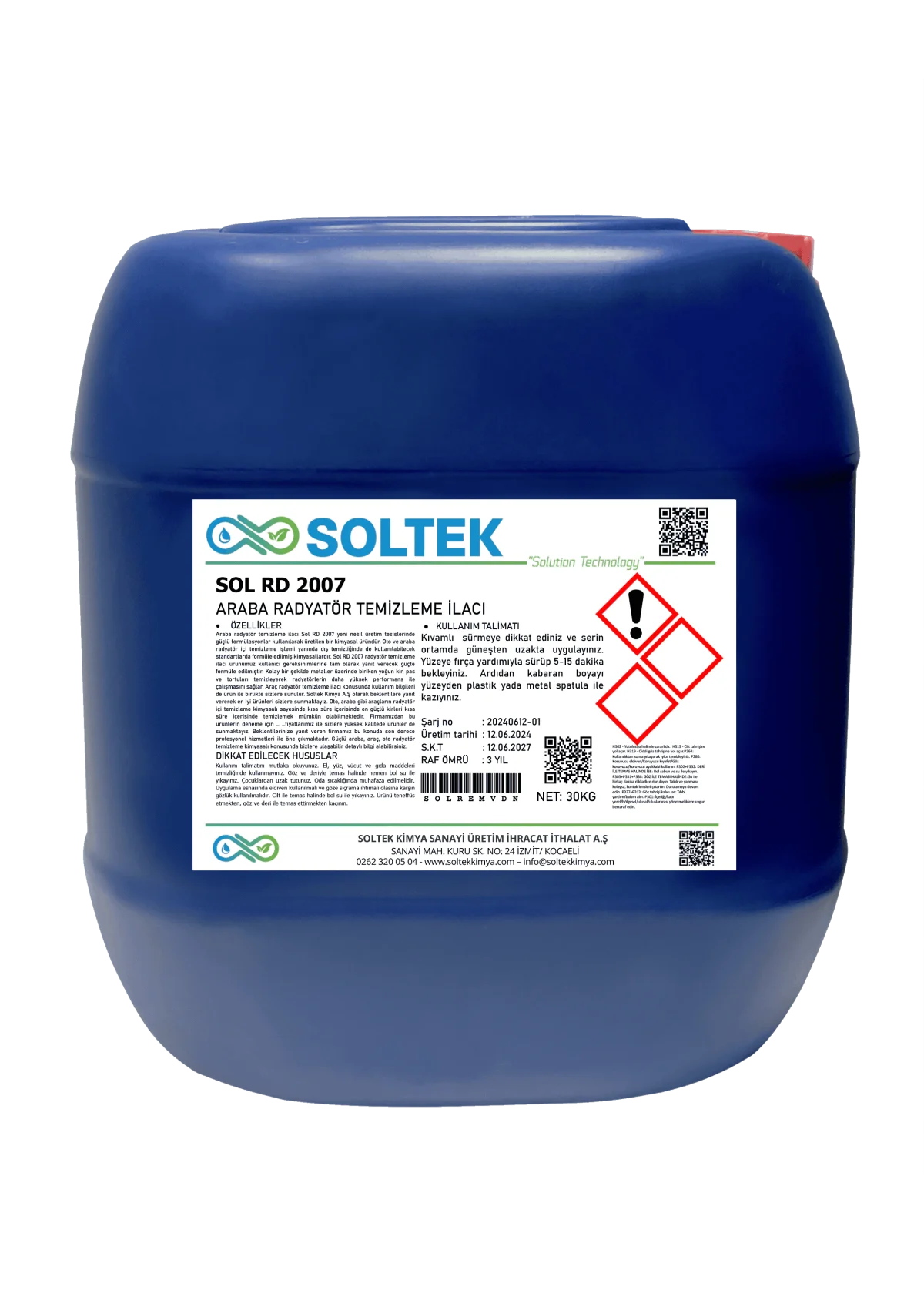 Oto radyatör temizleme ilacı Sol RD 2007 yeni nesil üretim tesislerinde güçlü formülasyonlar kullanılarak üretilen bir kimyasal üründür. Oto ve araba radyatör içi temizleme işlemi yanında dış temizliğinde de kullanılabilecek standartlarda formüle edilmiş kimyasallardır. Sol RD 2007 radyatör temizleme ilacı ürünümüz kullanıcı gereksinimlerine tam olarak yanıt verecek güçte formüle edilmiştir. Kolay bir şekilde metaller üzerinde biriken yoğun kir, pas ve tortuları temizleyerek radyatörlerin daha yüksek performans ile çalışmasını sağlar. Araç radyatör temizleme ilacı konusunda kullanım bilgileri de ürün ile birlikte sizlere sunulur.