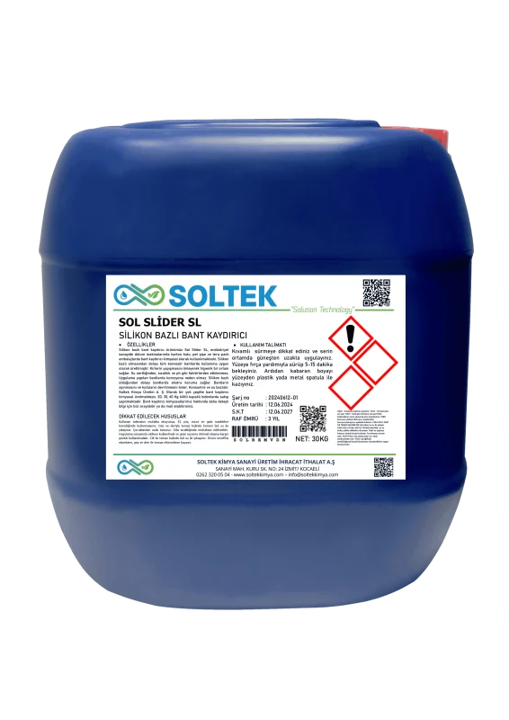Sentetik bazlı bant kaydırıcı ürünümüz Sol Slider SN paketleme ve dolum makinalarında kullanılan sentetik bazlı bant kaydırıcıdır. Profesyonel her tip konveyör bantlarda kullanıma uygundur. Şişe ve kutuların konveyör bant üzerinde devrilmesini önler. Üretim hatlarında dolumu yapılan ambalaj ve kutuların zarar görmesini engeller. Pet, pc ve şişe gibi içecek ve gıda dolum tesislerinde kullanılmaktadır. İşletme verimliliğini artırır. Konsantre olmasından dolayı kullanım birim maliyeti çok düşüktür. Bantlarda koruyucu özelliğinden dolayı korozyonu önler. Ph, suyun sertik ve sıcaklık faktörlerinden etkilenmez. Uygun konsantrasyonlarda metal, plastik ve paslanmaz gibi malzemelerin zarar görmesi imkansızdır.