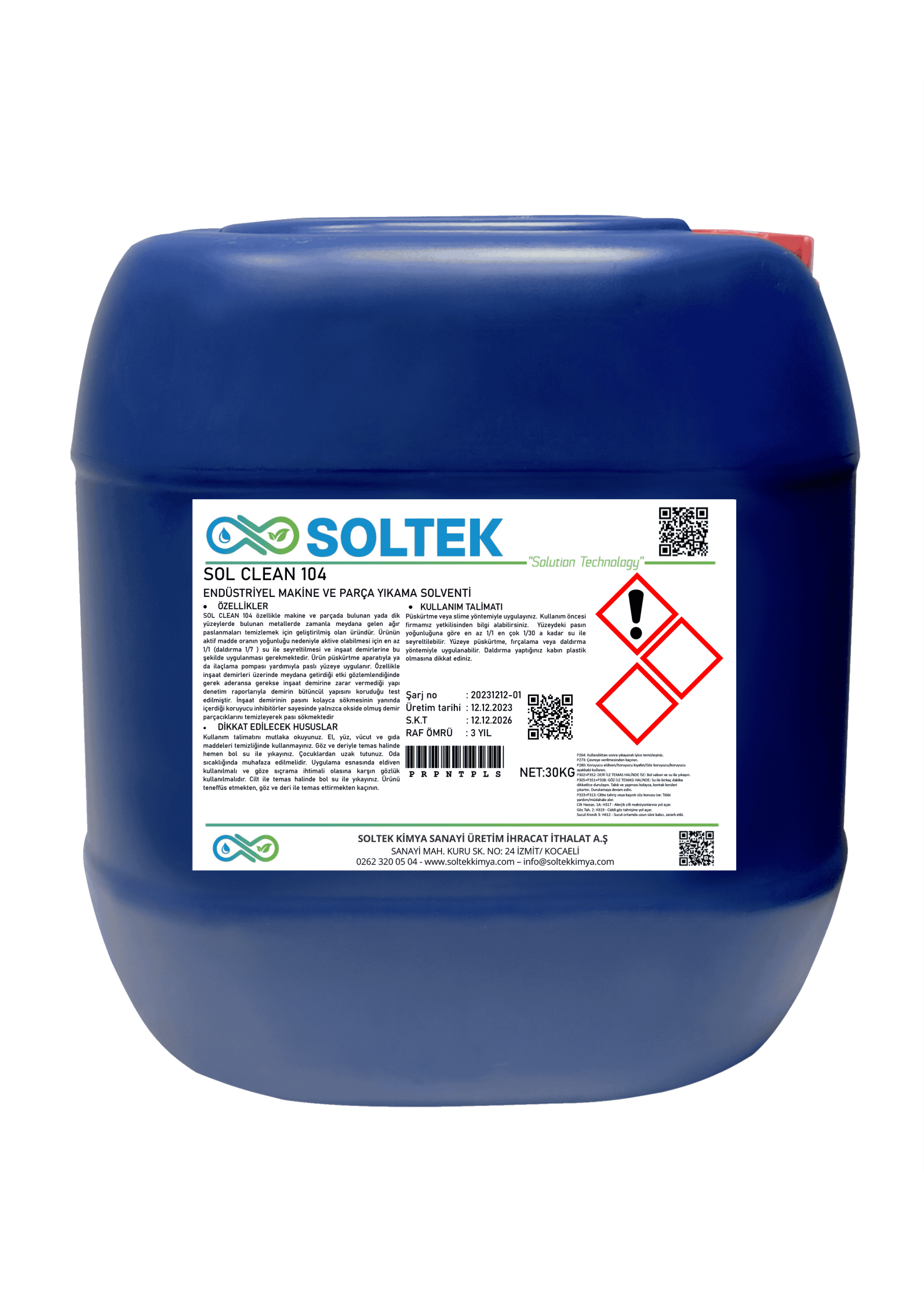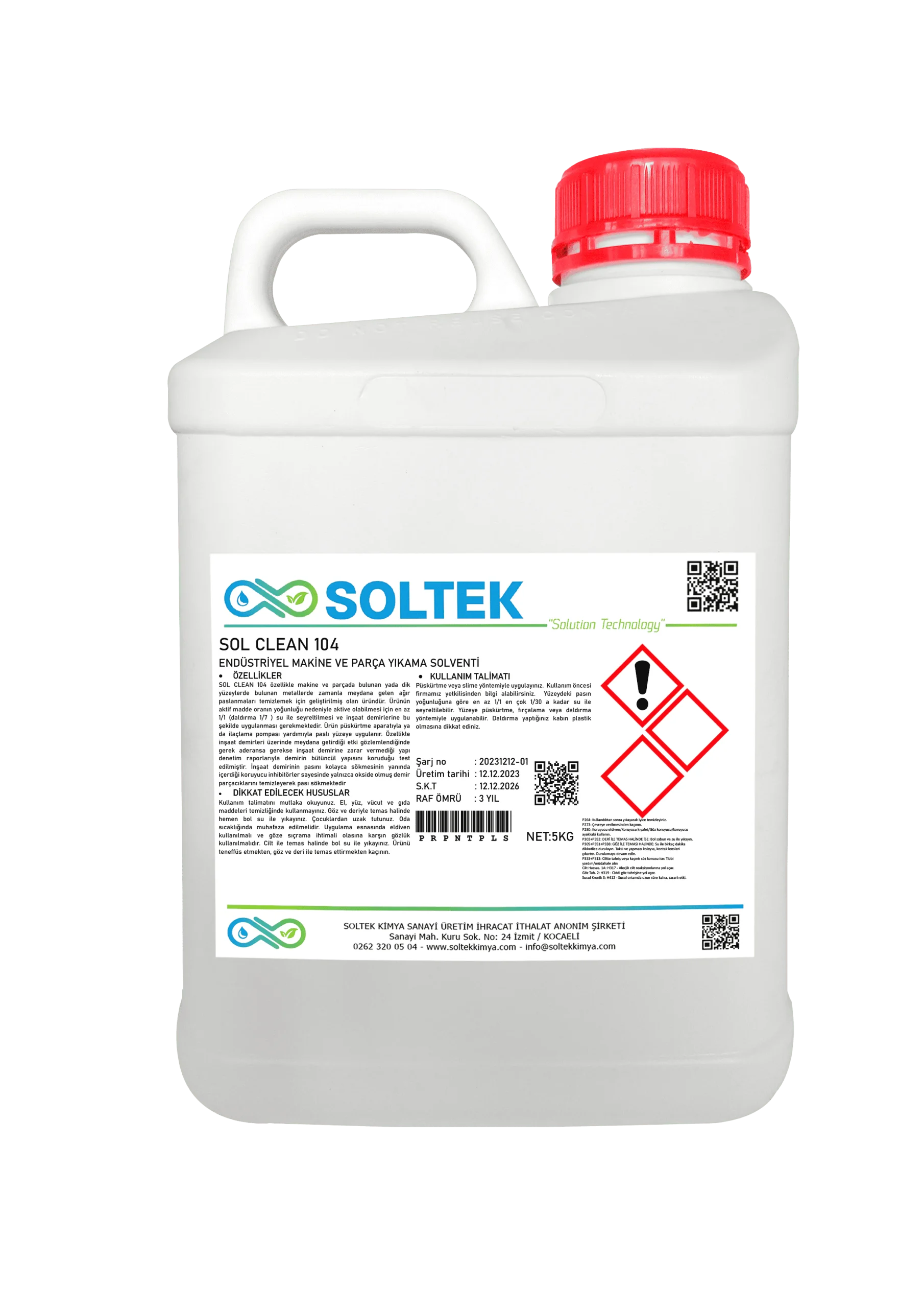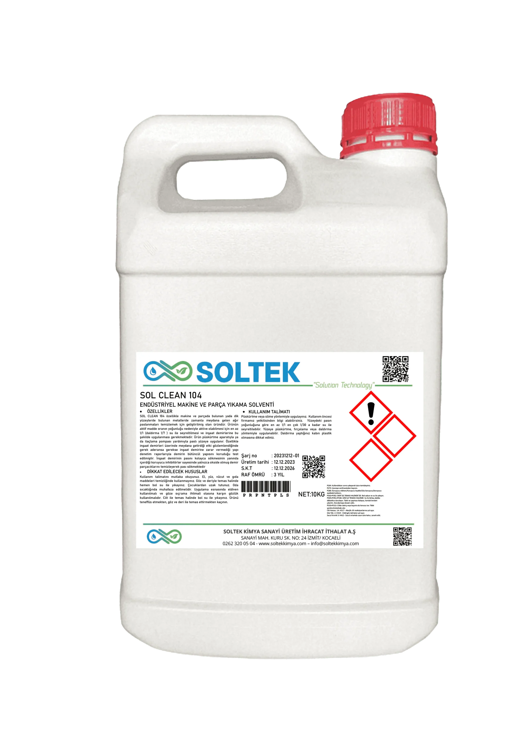 Solex Clean 104, özellikle makinelerinin taraklarında ve parçalarının temizlenmesinde kullanılan bir solvent türüdür. Parçaların temizlenmesinde daldırma yöntemi ile kullanılabilecek olan bu ürün büyük parçalar üzerinde püskürtme yöntemi ile kullanılabilir. Sanayi sektöründe kullanılan ekipman ve birçok makine türü temizliğinde temizleyici solvent olarak kullanılabilir. Kullanıcı beklentisine tam olarak yanıt veren Makine temizleyici solvent ürünümüz makine temizleme sırasında yüzey üzerindeki boyaya hiçbir surette zarar vermez. Bununla birlikte makine ekipmanların da tüm yağ, kir, leke birikintileri üzerinde oldukça etkili bir üründür. Makinelerin en ince ve küçük parça aralarına kadar biriken ve katılaşan yağ tortullarının kısa süre içerisinde temizlenmesine yardımcı olur. İstenilen miktarlarda satışını yapılmaktadır.